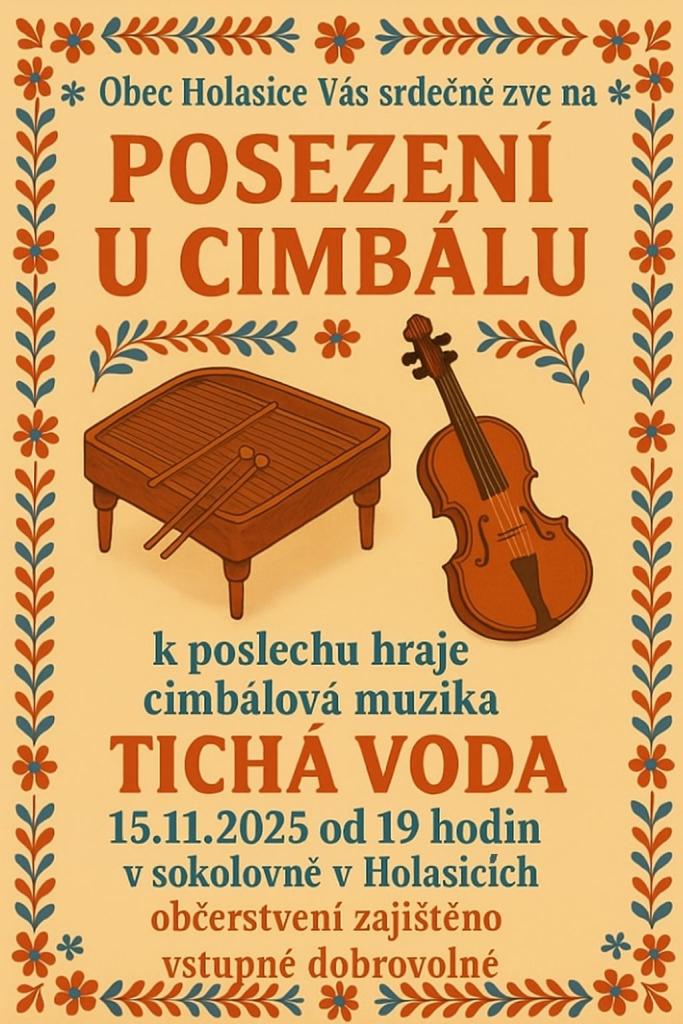 Obec Holasice Vás srdečně zve na hudební vystoupení cimbálové muziky Tichá voda, které se koná 15. listopadu 2025 v 19 hodin. Akce se uskuteční v sokolovně v Holasicích, kde bude zajištěno občerstvení. Vstupné je dobrovolné, takže si můžete užít příjemný večer plný muziky a dobré atmosféry. Těšíme se na Vaši účast.
