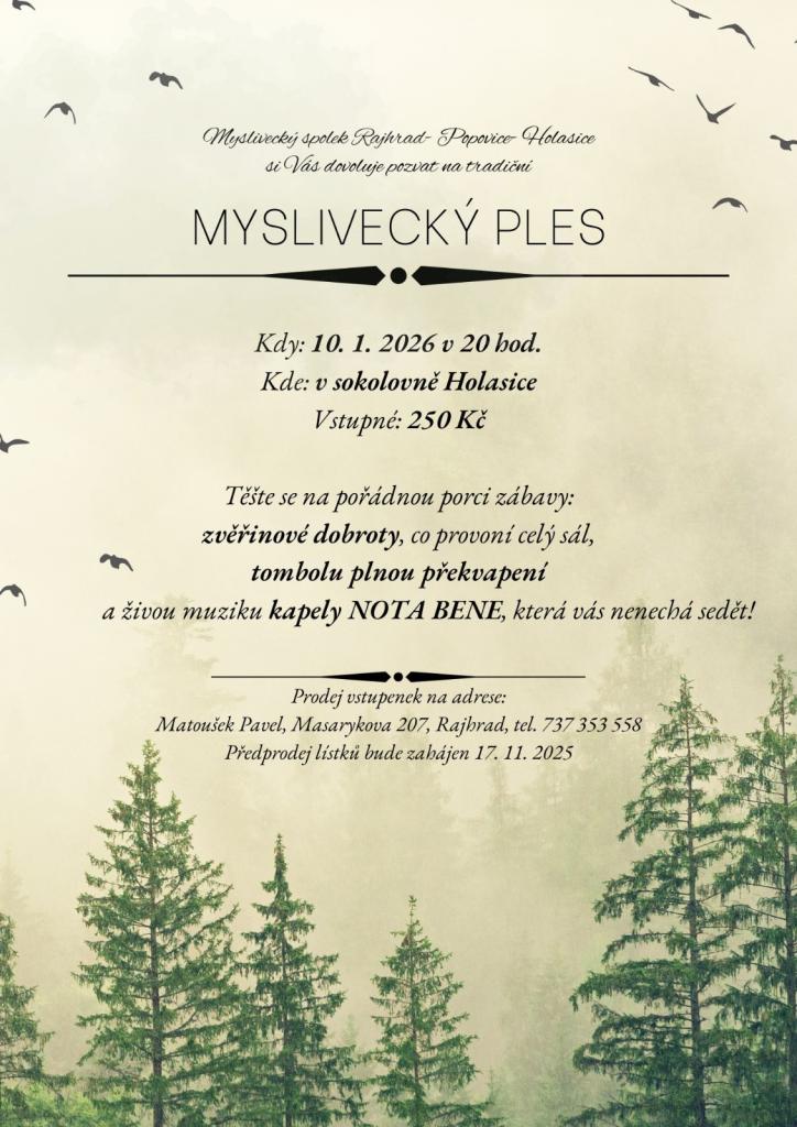 Zveme vás na tradiční Myslivecký ples, který se uskuteční 10. ledna 2026. Akce se koná v sokolovně v Holasicích a začíná v 20:00. Připravili jsme pro vás bohatý program, který zahrnuje zvěřinové dobroty, tombolu plnou překvapení a živou hudbu od kapely NOTA BENE. Tento ples slibuje skvělou zábavu a příjemnou atmosféru pro všechny návštěvníky.