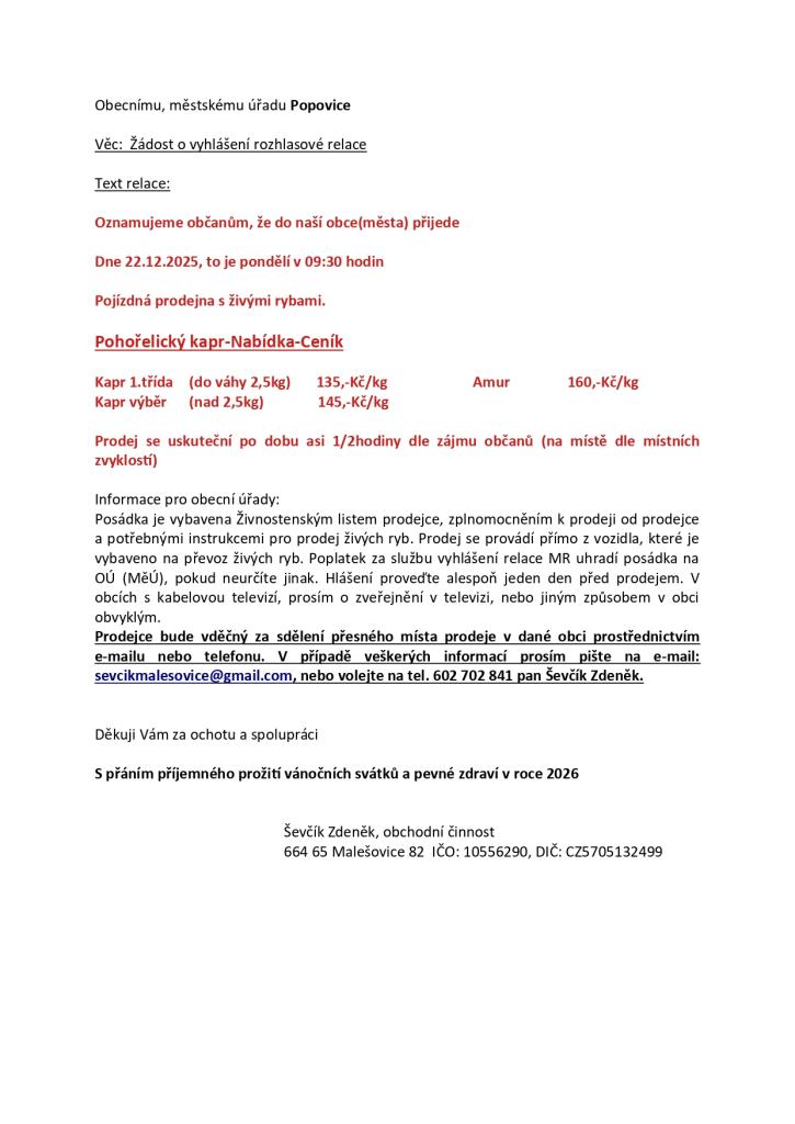 Oznamujeme občanům, že do naší obce přijede pojízdná prodejna s živými rybami. Prodej se uskuteční dne 22. prosince 2025 od 09:30 hodin. Nabízí se kapři a amuři různých tříd a velikostí. Prodej bude trvat přibližně 30 minut, záleží na zájmu občanů. Prodejce je vybaven potřebnými dokumenty a prodej se uskuteční přímo z vozidla.