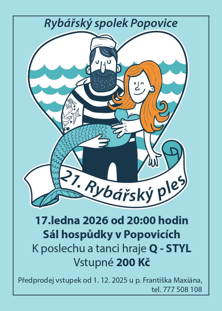 Rybářský spolek Popovice zve na ples, který se koná 17. ledna 2026 od 20:00 hodin v sále hospůdky v Popovicích. K poslechu a tanci hraje kapela O - STYL. Vstupné na akci je 200 Kč. Předprodej vstupenek je zahájen od 1. prosince 2025 u pana Františka Maxiána, kontaktovat ho můžete na telefonním čísle 777 508 108. Přijďte si užít večer plný zábavy a tance.
