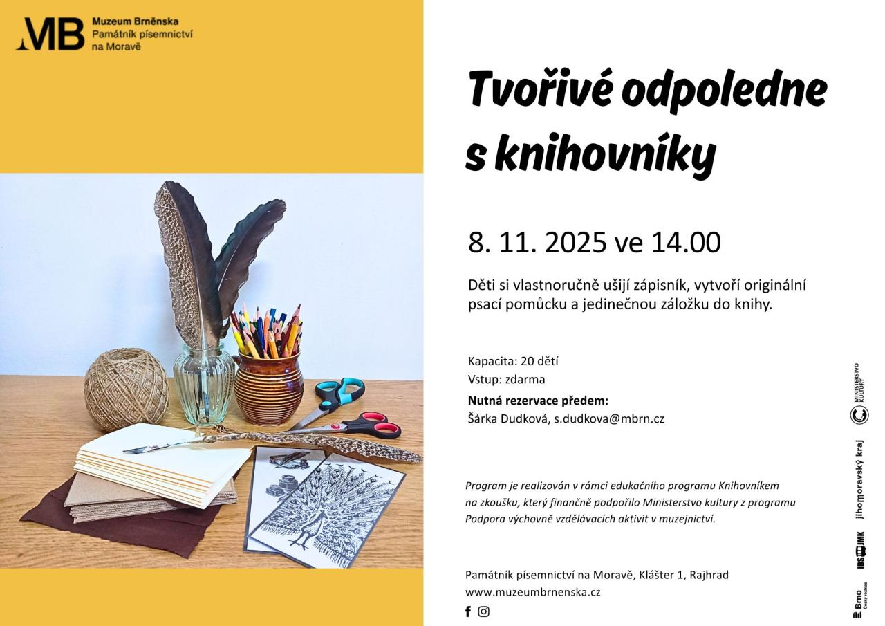 Přijďte na tvořivé odpoledne do Památníku písemnictví na Moravě, které se koná 8. listopadu 2025 ve 14:00. Děti si zde vlastnoručně ušijí zápisník, vytvoří originální psací pomůcku a jedinečnou záložku do knihy. Kapacita je omezena na 20 dětí, proto neváhejte a rezervujte si místo dopředu. Program je součástí edukačního projektu, který podpořilo Ministerstvo kultury.